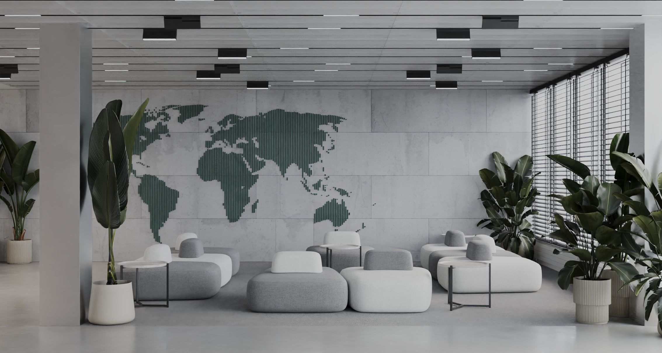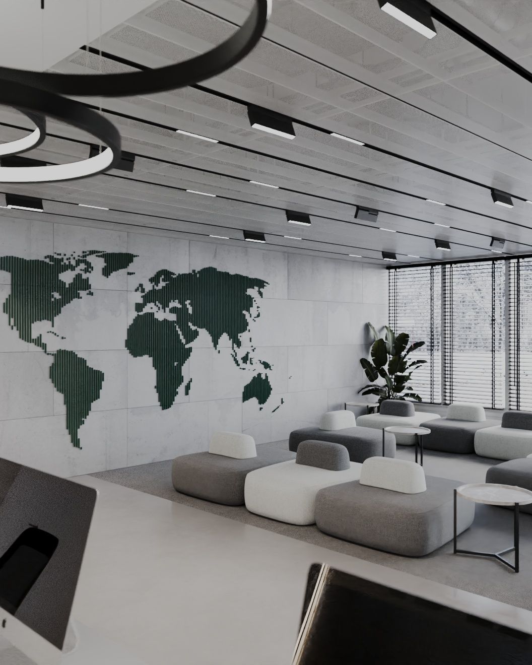 The wall installation depicting a world map symbolizes the company’s global presence and interconnected logistics network. Every design element — from lighting fixtures to material junctions — was curated to express order, precision, and timeless elegance. This project redefines the aesthetic standards of an industrial workspace, proving that even highly functional interiors can convey character and emotion. The result is not merely an office, but a spatial representation of a brand that values progress, clarity, and design integrity.