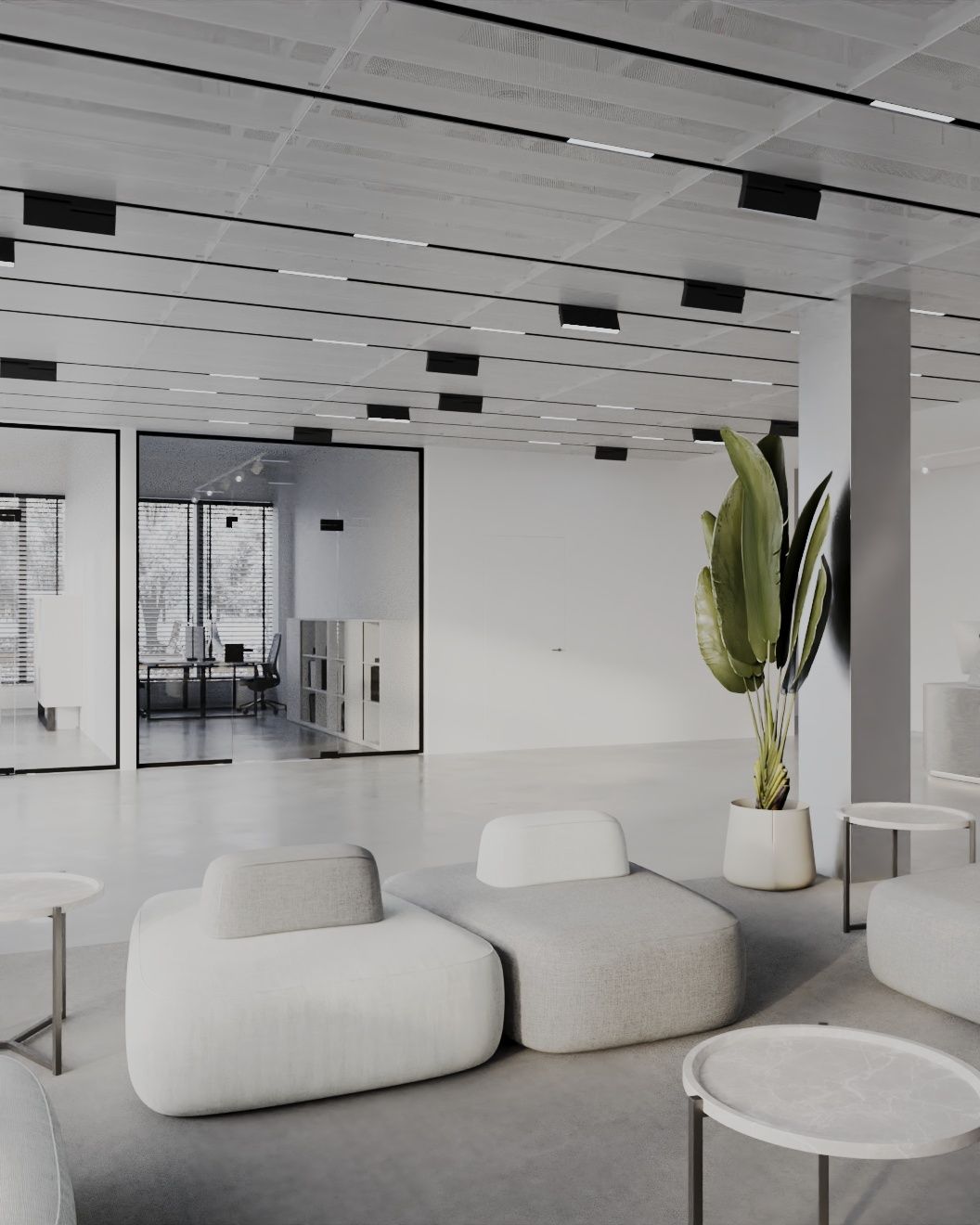 Natural light plays a central role in shaping the interior, interacting with reflective materials to enhance the perception of volume and clarity. The rhythmic ceiling composition and subtle illumination accents emphasize the geometry of the space while maintaining a sense of openness. In contrast to the sleek metal and glass, soft modular furniture and generous greenery in the lounge zone bring warmth and human comfort into the corporate environment.